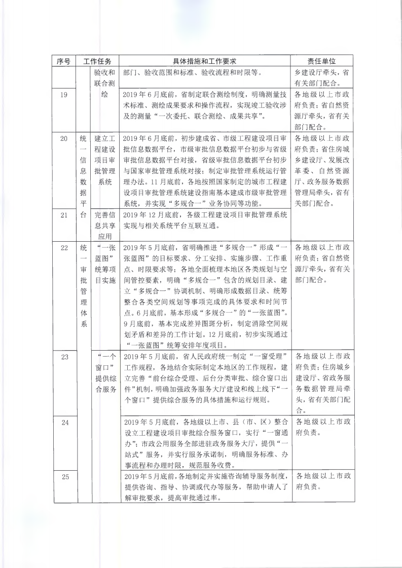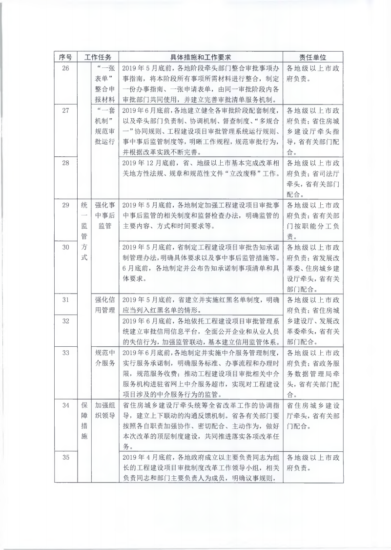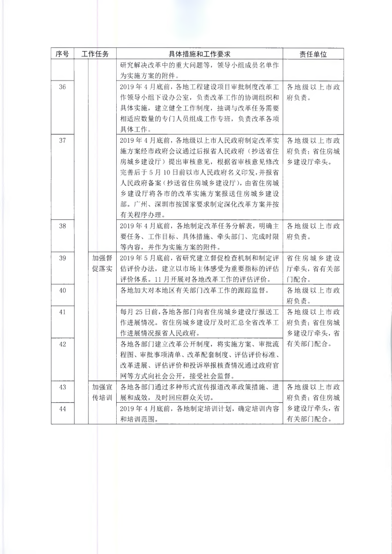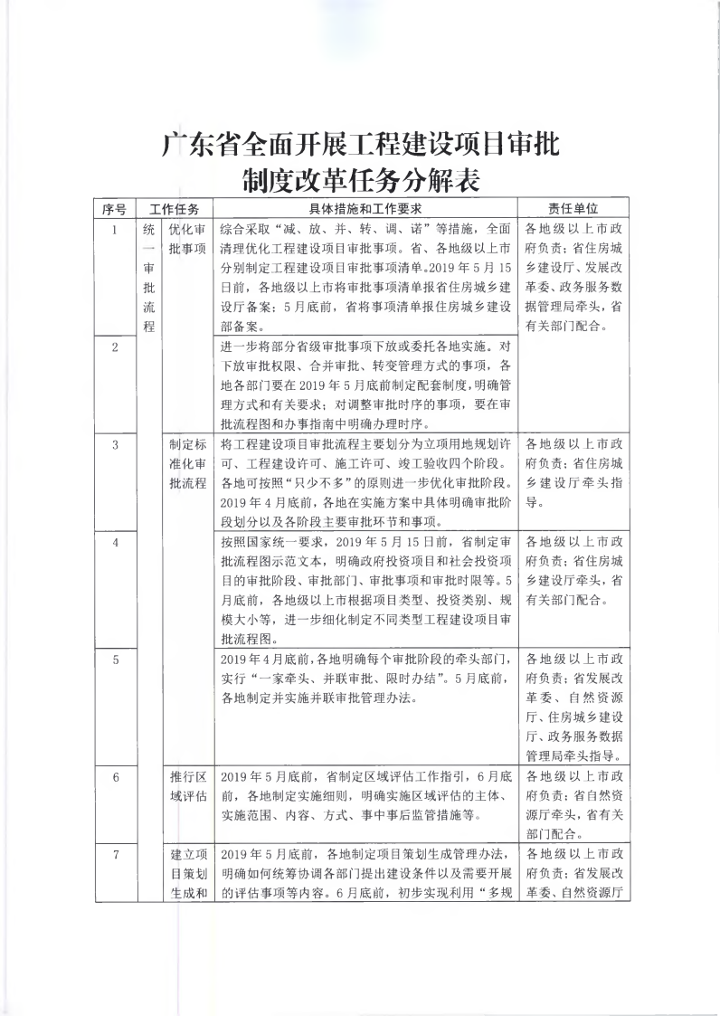 為貫徹落實(shí)《國務(wù)院辦公廳關(guān)于全面開展工程建設(shè)項(xiàng)目審批制度改革的實(shí)施意見》(國辦發(fā)〔2019〕11號)和《廣東省人民政府關(guān)于印發(fā)廣東省全面開展工程建設(shè)項(xiàng)目審批制度改革實(shí)施方案的通知》(粵府〔2019〕49號)要求,經(jīng)省人民政府同意,現(xiàn)將《廣東省全面開展工程建設(shè)項(xiàng)目審批制度改革任務(wù)分解表》印發(fā)給你們,請認(rèn)真組織實(shí)施。